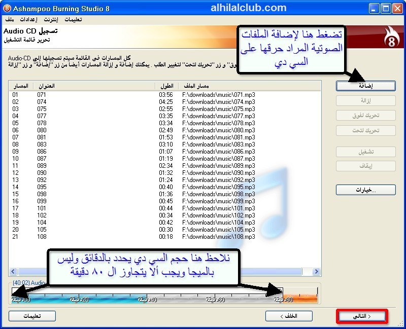 بعدها تختار الملفات الصوتية المراد حرقها على السي دي