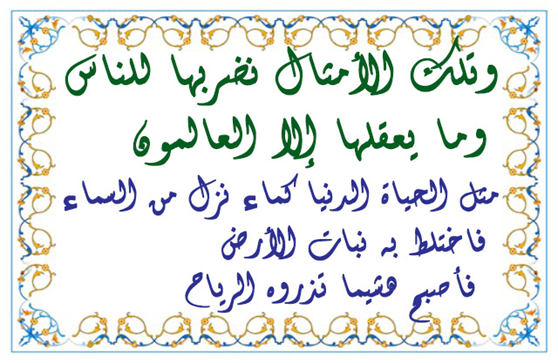 -الثانية :قوله تعالى: ** وَاضْرِبْ لَهُم مَّثَلَ الْحَيَاةِ الدُّنْيَا كَمَاءٍ أَنزَلْنَاهُ مِنَ السَّمَاءِ فَاخْتَلَطَ بِهِ نَبَاتُ الْأَرْضِ فَأَصْبَحَ هَشِيمًا تَذْرُوهُ الرِّيَاحُ ۗ وَكَانَ اللَّـهُ عَلَىٰ كُلِّ شَيْءٍ مُّقْتَدِرًا) (الكهف:45)