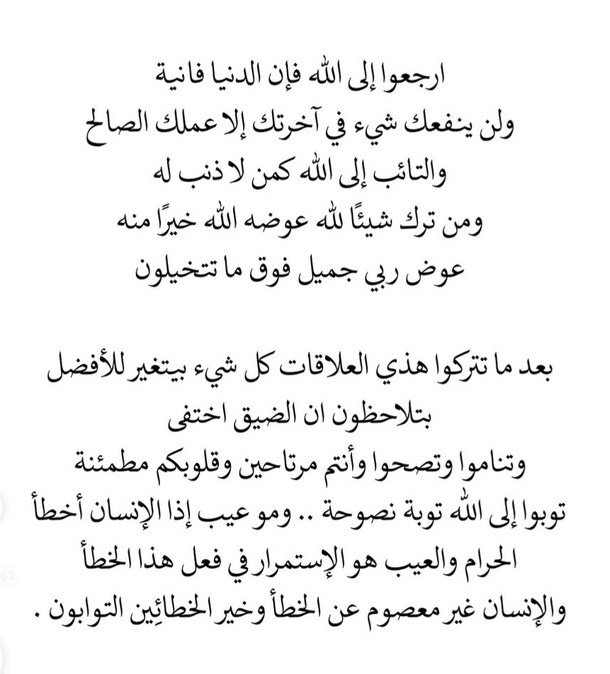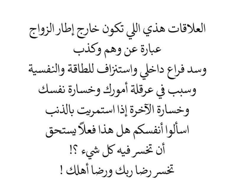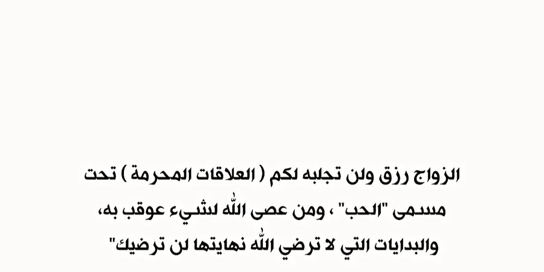 خاتمة على المسلم أن يتذكر أن الشريعة الإسلامية جاءت لتحفظ القلوب والنفوس من الألم والمعاناة، وأن السعادة الحقيقية تكمن في اتباع أوامر الله والابتعاد عن نواهيه. فمن وجد نفسه في علاقة محرمة، فليتب إلى الله توبة نصوحًا، والله يقبل التائبين ويبدل سيئاتهم حسنات. {﴿إِنَّ اللَّهَ يُحِبُّ التَّوَّابِينَ وَيُحِبُّ الْمُتَطَهِّرِينَ﴾} (البقرة: 222).