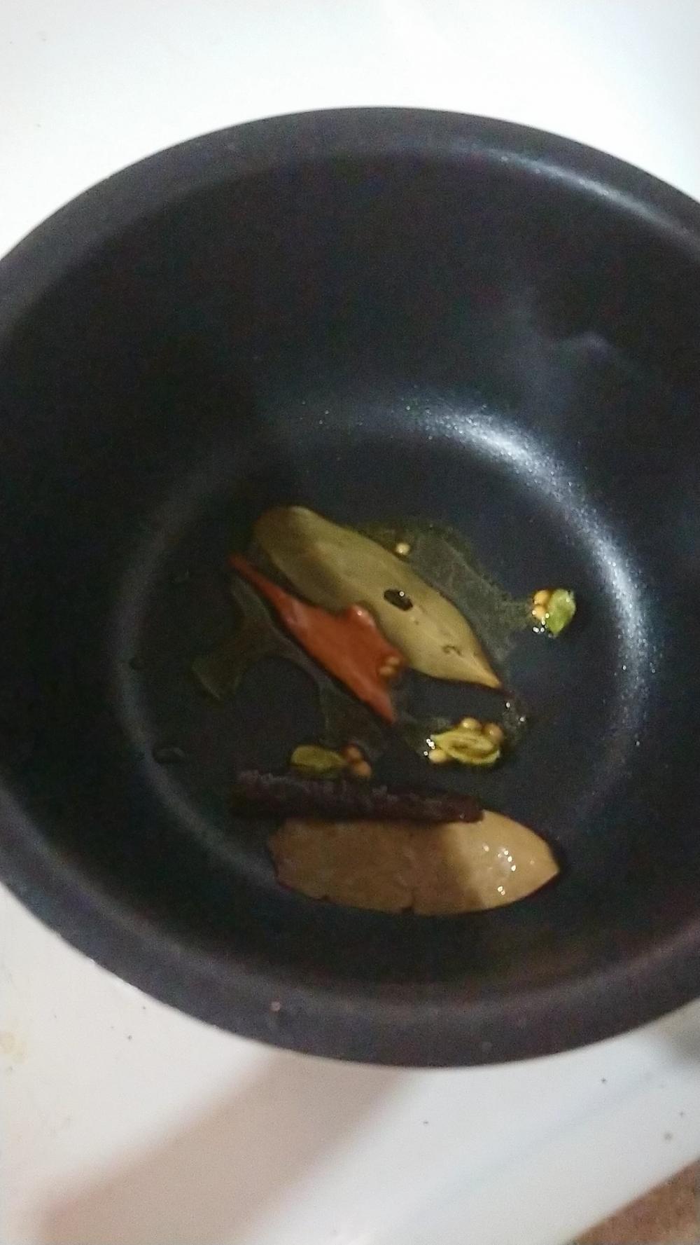 في قدر ع النار ملعقتين كبيرة زيت نضيف لها البهارات الصحيحه لحد ما تطلع ريحتها