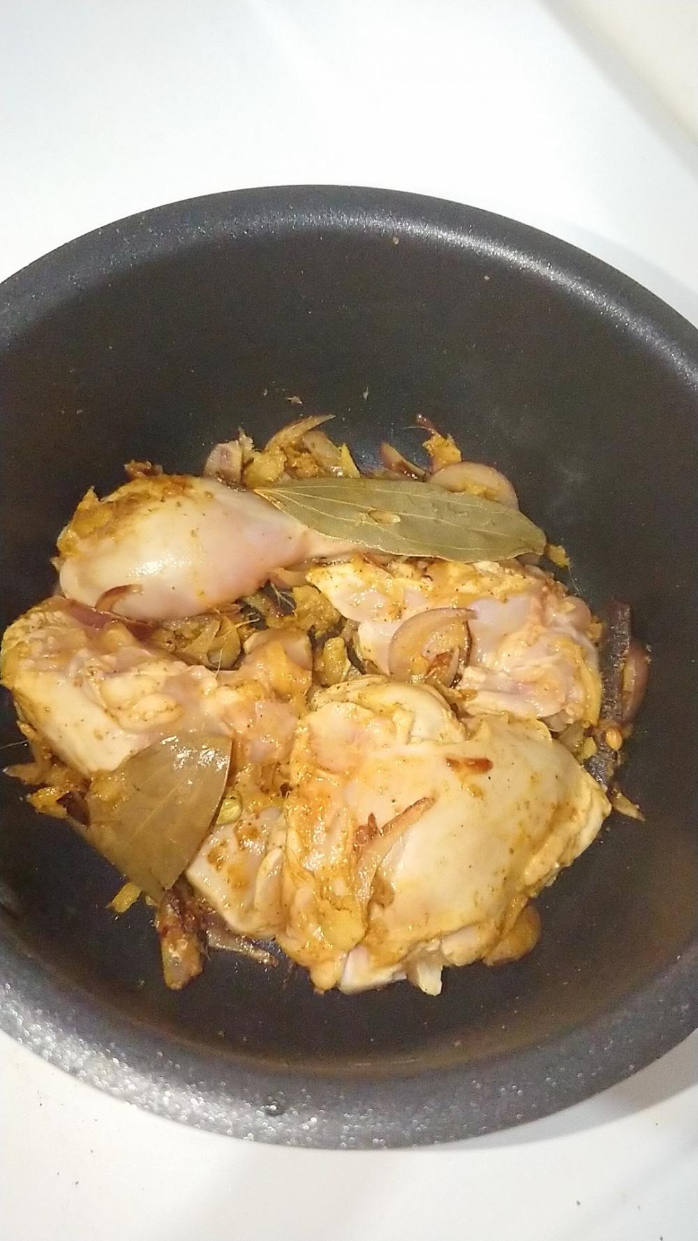 أضيف عليها البصل ونقلبها ونضيف الثوم والزنجبيل ونلقبهم ونضيف قطع الدجاج وبهارات البرياني وكركم وكاري ونحركها لحد ما يتغير لون الدجاج