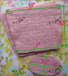 قصي القماش بالقياس الذي تريدين وهنا واضح من الصورة عرض القطعة وطولها قطعتين للجوانب وقطعة بيضاوية لعمل القاعدة..
