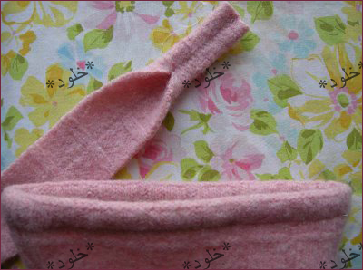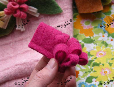 نبدأ نلف القطعة ونبرمها على بعض حتى نحصل على شكل دائري ونثبتها بالابرة بغرزة بسيطة