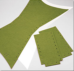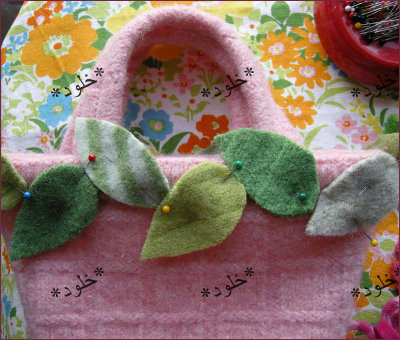 نقص قطع على شكل ورقة شجر بألوان متفاوتة ومثل ما تلاحظين القماش لا خيوط ولا تنسيل ما يحتاج خياطة بعد القص ..نثبيتها بالدبابيس بشكل مرتب على أطراف الشنطة ..