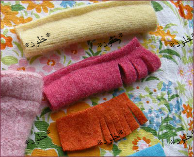 لعمل الوردة ..نقص قطعة مستطيلة من القماش ونخيطها من الجهتين على بعض ..ثم نقصها من الجهة الثانية على مسافات متباعدة مجرد قص أطراف دون الوصول للنهاية ..يعني مثل عمل فتحات بسيطة