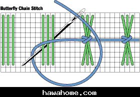 15- غرزة الفراشة :نعمل أولا ثلاث غرز متراصة إلى جانب بعضها كالتي تشاهدينها في الصورة باللون الأخضر نترك مسافة مناسبة ثم نشتغل غرز أخرى بالعدد المطلوب حسب التصميم لدينا ثم نشتغل عليها غرزة أخرى (الخيط الأزرق ) بعد تثبيت الخيط في النسيج يمرر فوق الغرز الثلاث ثم ندخل الإبرة من تحت الخيوط ونسحب للأعلى على أن يبقى الخيط تحت الإبرة ويشد ليشكل عقدة على الغرز الثلاثة .