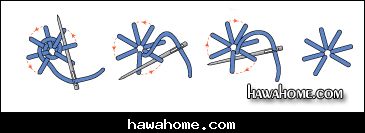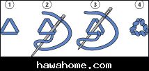 اصنعي ثلاث غرزة مستقيمة على شكل مثلث ثم على كل غرزة من أطراف المثلث اشتغلي غرزة سلسة ملتوية على نفس الخيط من غير أن تغرزي الإبرة في النسيج وهذه الغرزة عددها اختياري حسب ما ترغبين أو حسب التصميم .
