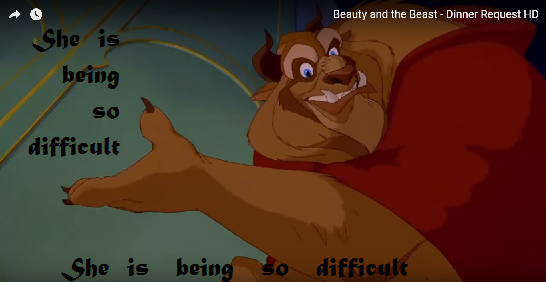 (( مقطع من فلم الجميلة والوحش :- فيه عندما اراد الوحش ان يعزمها على العشاء وهي غاضبة منه وترفض ويحاول الخدم المسحورين تعليم الوحش اللطف وكيف يكون لبق وتذكيره انها الفتاة التي قد تكون سببا في فك سحره )))