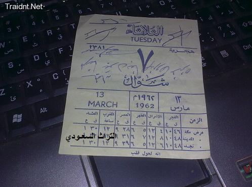 ورقة من تقويم سعودي قديم يعود تاريخه إلى سنة 1381هـ ، وتظهر المدن التالية فقط ( مكة ، المدينة ، نجد )