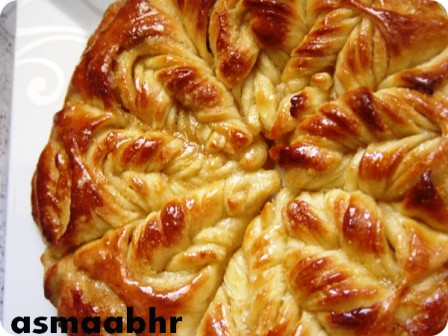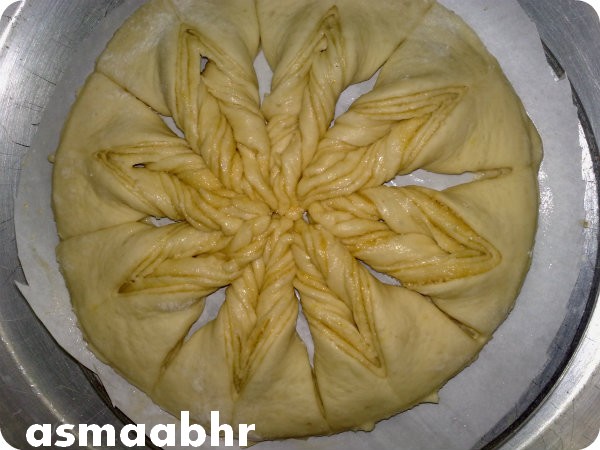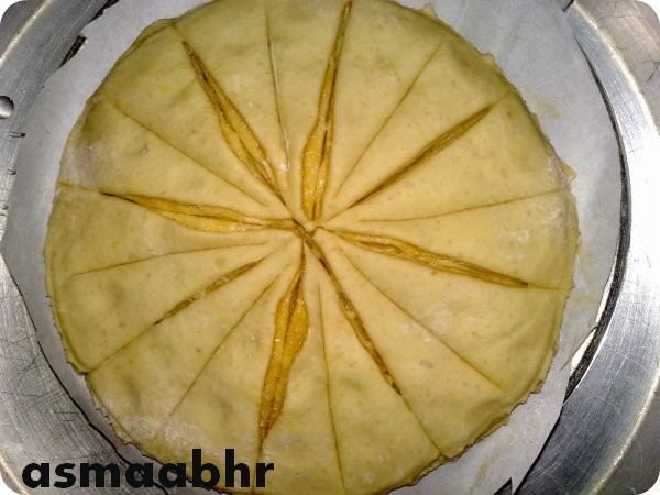 بسكين حاد نقطع العجينة الى مثلثاث مبتدئين من منتصف العجينة الى خارج الدائرة حتي نصل الطبقات المسحوبة