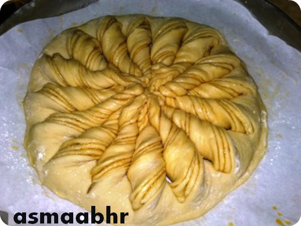 نبسط الكويرة الاولى بسمك 3 الى 5 ملم و ندهنها بالزبدة المذابة ونرشها بقليل من السكر الناعم وحبة البركة