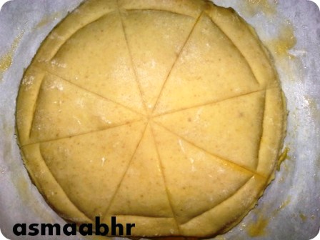 بسكين حاد نقطع العجينة الى مثلثاث مبتدئين من منتصف العجينة الى خارج الدائرة