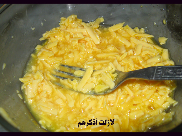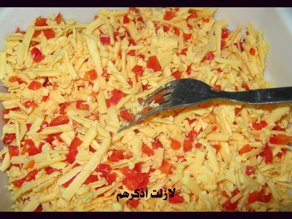 جبن تشيدر مع فلفل أحمر بارد وباربيكا و(فلفل أحمر مجفف ومطحون فيه منها البارد والحار ) بيضة (بالصورة لسه ماحطيت البيض)