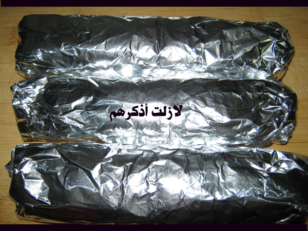 بعدين نجيب خبزة عربي ( مفرود ) وندهنها بخليط البطاطس ثم نفرش عليها خلطة الدجاج ثم نلفها بشكل رول ثم نغلفها بالقصدير وتوضع في الفريز لمدة نص ساعه حتى تتماشك بدون ماتجمد
