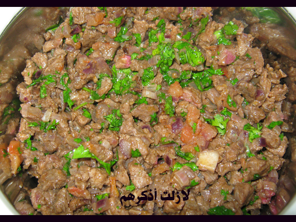 يحمي زيت تقريبا نص فنجال ثم يوضع عليه اللحم ويشوح ولما يفتح لونة يوضع عليه بصل مقطع ويقلب إذا بدا البصل يذبل نضيف طماطم مقطع صغير ولما يذبل نضيف الملح نقلب بعدين نطفي النار ونظيف كزبرة طازجة مفرومه تعطي طعم خيالي