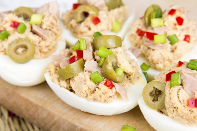 إحشي زلال البيض مقدار ملعقة كبيرة من مزيج صفار البيض والتونة .