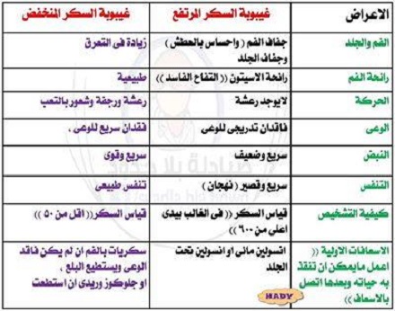 معلومات عن غيبوبة السكري سواء ارتفاع او انخفاض :