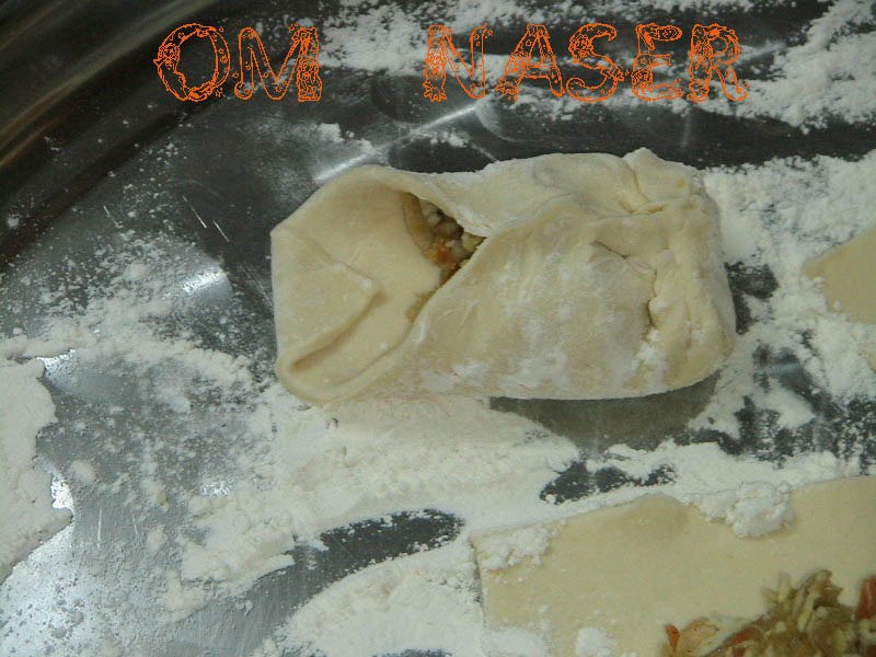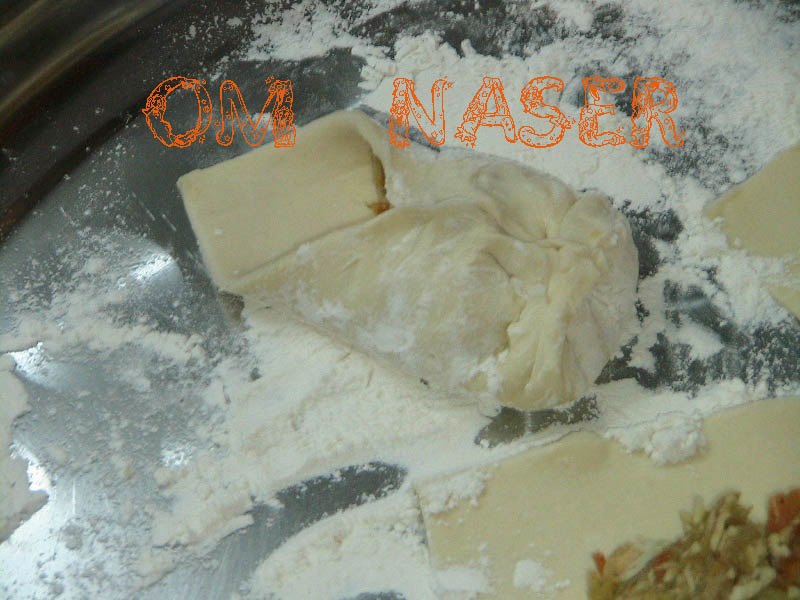 هنا مكان الشغل رشيت دقيق في صينية العمل ووضعت قطع البيف باستري