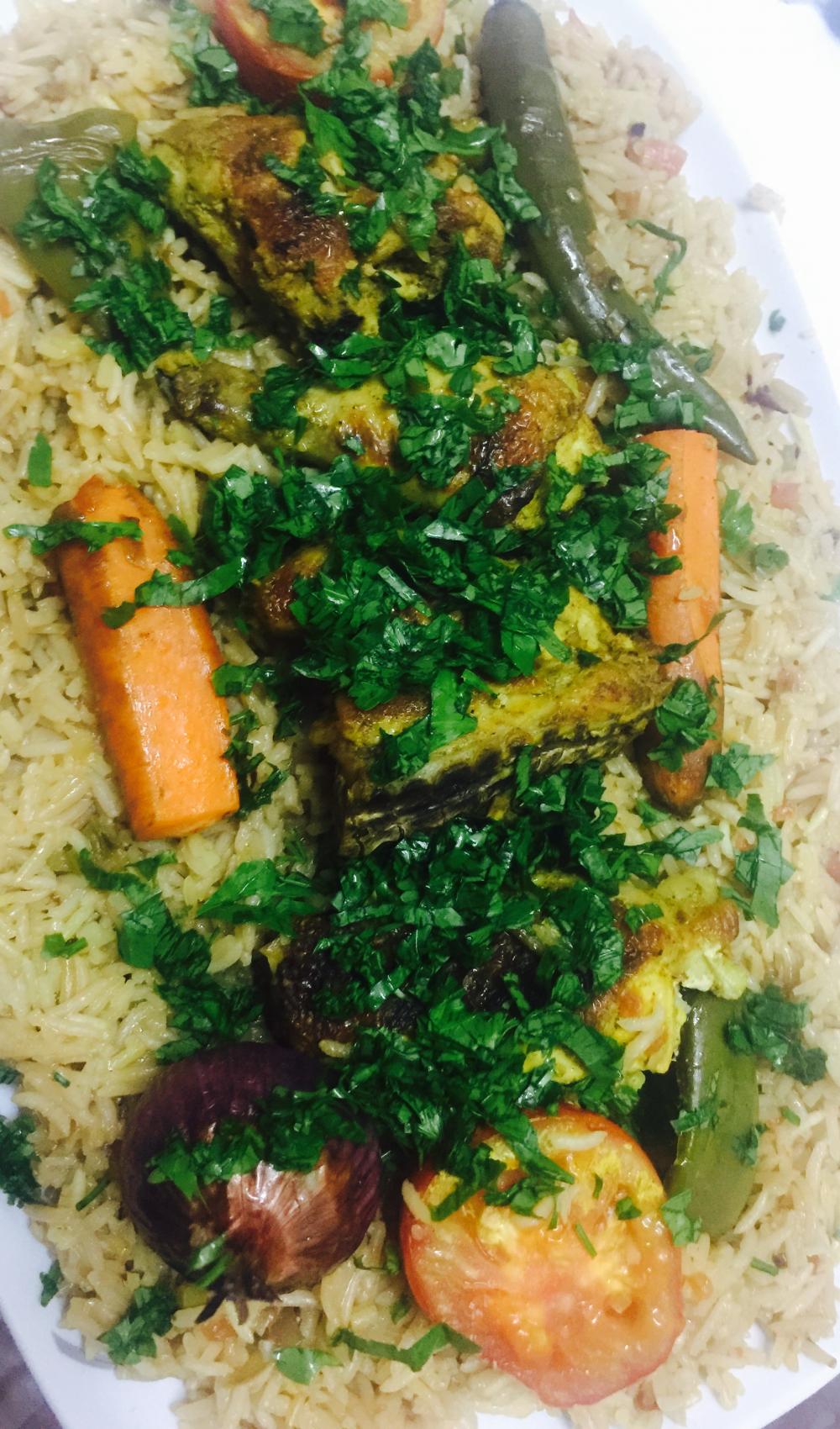 ارفع القصدير واحمره من فوق ثم اضع الدجاج على الازر ويتم تبخيره