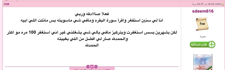 (( - الاستغفــــــار 100 مرة ولكن بتركيز وقصد مغفرة الذنوب والندم على ما مضى .. افضل من ان تستغفري الالف المرات بلسانك فقط وليس بقلبك ولسانك .. فاعرف اخت كانت تستغفر في اليوم 100 مرة لكن بصدق وتركيز ولم يمض اسابيع الا وهي مخطوبة والان متزوجة وسعيدة وعندها بنت علما اني كنت اقول لها قبل تنخطب استغفري بالالاف فقالت لي اعرف اخت لازمت الاستغفار من قلب صادق نادم تائب 100 مرة في اليوم وبعد شهر انخطبت من شخص فيه كل المواصفات .. وانا والله لي اسبوعين استغفر 100 مرة مع التوبة بصدق اثناء الترديد + لا حول ولا قوة الا بالله 100 مرة + الحمدلله رب العالمين 100 مرة + اللهم صل وسلم وبارك على نبينا محمد 100 مرة + ما ذكرته سابقا .. وهلت علي البشائر ولله الحمد والمنة الله يتمم يارب ..))
