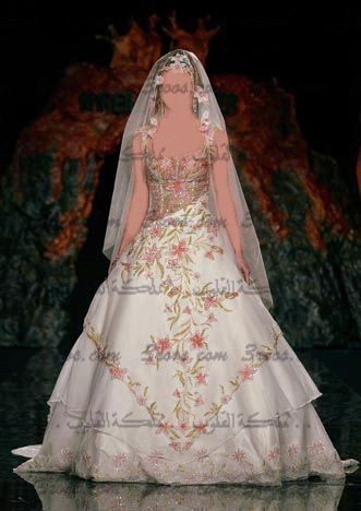 فستان خارج عن المألوف .. اخنا تعودنا فستان العروس أبيض سادة لكن هالفستان ضم مجموعة ألوان هادية خلت الفستان أحلى ونلاحظ أن الجزء الفوقي صاير ذهبي مو ابيض .. والأهم قصة الخصر صايرة مايلة فتبرز المنطقة ... الفستان عجبني
