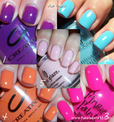 مجموعة ألوان على الموضة ... اللون اللي بالوسط مذهل ... الوردي والازرق والبنفسجي عندي مثلهم روووعة على الأظافر
