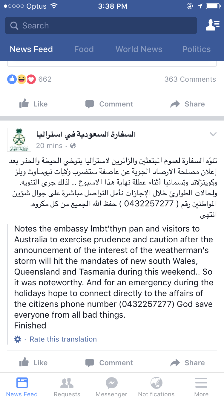 تنوّه السفارة لعموم المبتعثين والزائرين لاستراليا بتوخي الحيطة والحذر بعد إعلان مصلحة الارصاد الجوية عن عاصفة ستضرب ولايات نيوساوث ويلز وكوينزلاند وتسمانيا أثناء عطلة نهاية هذا الاسبوع .. لذلك جرى التنويه. ولحالات الطوارئ خلال الإجازات نأمل التواصل مباشرة على جوال شؤون المواطنين رقم ( 0432257277 ) حفظ الله الجميع من كل مكروه.