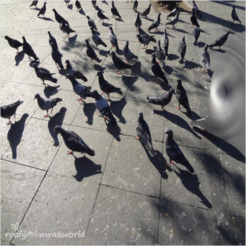 مشينا شويه وشفنا ساحه صغيره فيها حمام وناس جالسه وجلسنا نتصور