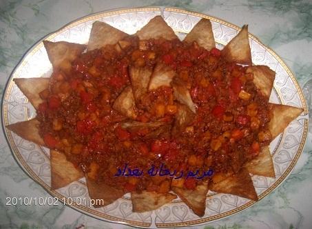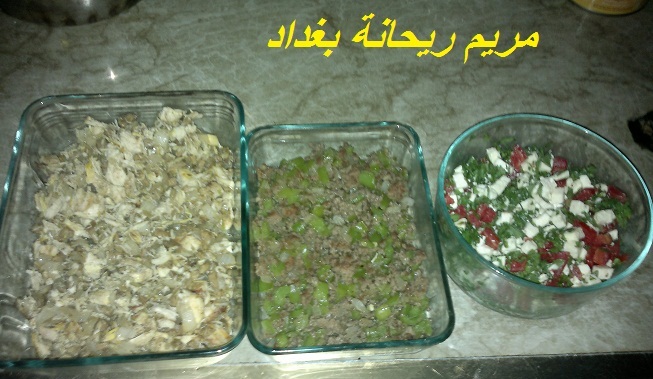 حشوة (جبن وكرفس وطماطم)+ حشوة ( قطع صدور دجاج مسلوقة ومبهرة وبصل ومشروم محموسين شوية عالنار )+ حشوة( لححم مفروم وبصل وفلفل اخضر وبهار محموسين عالنار )