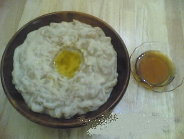 الحين صار عندنا لبن مغلي (فروقه) وقطع العجين ،، تسقط حبات العجين في القدر على دفعات كل ماغلت دفعه تسقط الدفعه الثانيه لضمان استوائها ،، وتقدم مع السمن والعسل .. والنتيجه تكون بهذا الشكل