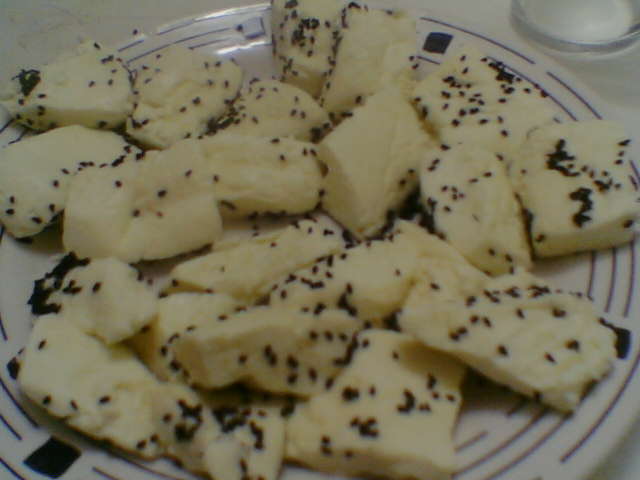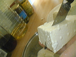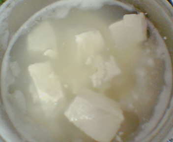 ضعها في قدر ونضع عليها ملح خشن (ملح صخري)كل صف من مكعبات الجبنة نضع عليه ملح ونغطيها ونتركها أقل شيء 7 ساعات