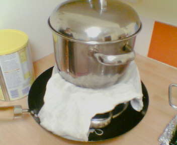 ونضعها في مكان دافئ (أنا وضعتها في فرن دافئ او نلفها ببطانية ونتركها ساعت