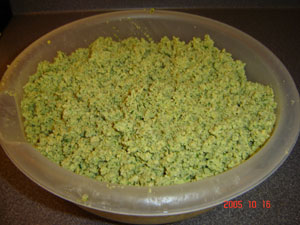 * ينقع الحمص ويغسل ويصفى من الماء ثم يفرم او يطحن على ماكينة اللحمه على الشفرة الناعمة مع الفول المجروش ثم يعاد طحنه مره أخرى مع البصل والثوم والبقدونس (كما في الصورة)