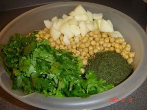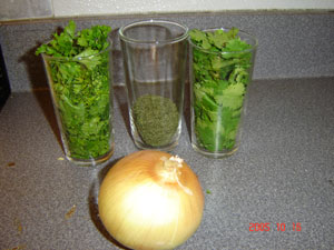 كوب حمص وكوب فول مدشوش وبصله كبيره و4 فصوص ثوم وبقدونس وكزبره خضرا