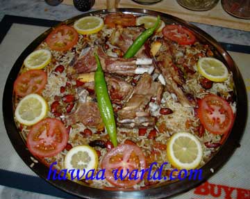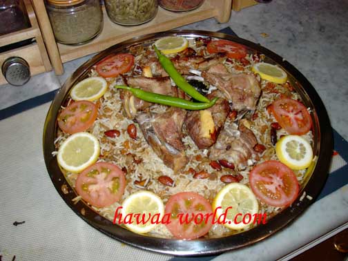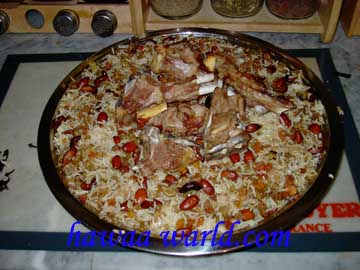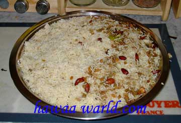 نغطي سطح الرز بالمكسرات والصنوبر والزبيب وثم نضع اللحمة المحمرة