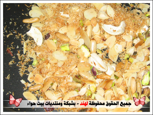 بالنسبة لي وضعت ( صنوبر + فستق + كاجو + جوز شرائح + جوز هند إمممم طعمه يجنن لما يتحمر )