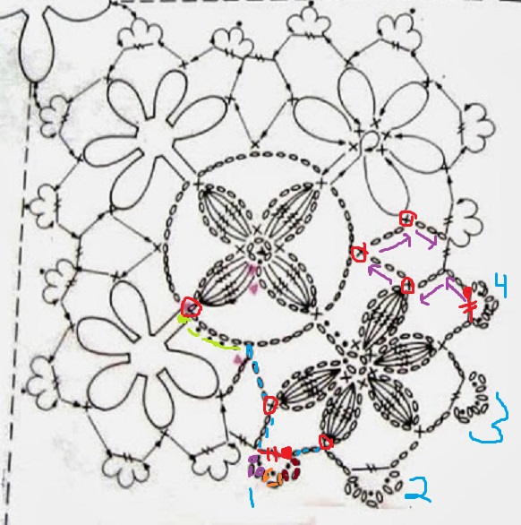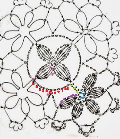 17- نكمل الفراغ الثاني ثم الثالث ثم الرابع بنفس الطريقة وبمجرد ننتهي من غرزة العمود اللي لونها احمر في الفراغ رقم 4 نعمل 6 غرز سلسلة ثم غرزة حشو في رأس الورقة الخامسة للزهرة ثم 3 سلسلة ثم غرزة حشو في السلسلة السادسة من ال11 سلسلة (مكان السهم الأخضر) ثم 3 سلسلة ثم غرزة حشو في رأس الورقة ثم 3 سلسلة ثم عمود (مكان السهم العنابي) وبعدها نبدأ في الثلاث غرز بيكو مرة أخرى.
