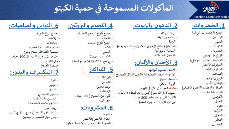 الكيتو نظام غذائي يعتمد على 20% بروتين + 75% دهون صحيه + 5% كربوهيدرات البروتين : اللحوم بكافة انواعها والدجاج والاسماك والتونه والجمبري والبيض الكربوهيدرات : الخضار الغير نشويه + ورقيات خضراء دهون صحيه : زيت زيتون ، زيت جوز الهند ، الزبده ، الاجبان كاملة الدسم ، بعض انواع المكسرات والبذور يعني ببساطه ممنوع النشويات والسكريات بكافة انواعها واشكالها حتى الفواكه ممنوعه بإستثناء حبتين ثلاثه توت وفراوله بالاسبوع مره ويفضل انها تؤجل الى الشهر الثاني من الرجيم وانا اشوف كرأي شخصي اذا ماعندك مشاكل صحيه محتاجه العلاج بهذا الرجيم فالافضل انك تسوين رجيم يشبه الكيتو لكن مش كيتو يعني ببساطه اعتمدي في وجباتك على البروتين الحيواني + خضار + طبق سلطه خضراء وممكن مع الغداء تاكلين 4 ملاعق رز او مكرونه او نص خبز اسمر عشان ما تحسين بالحرمان وتقدرين تستمرين لان الكيتو مشكلته يحتاج حسابات دقيقه للسعرات الحراريه وانك تعرفين توازنين كمية البروتين والدهون والكربوهيدرات واذا زودتي شي عن شي ممكن يخرجك من الكيتوسس ويثبت وزنك او ربما يزيد لانه يعتمد على اضافة الدهون بالوجبات عشان كذا اقول سوي نظام يشبه الكيتو لكن دهون اقل وعادي كلي نشويات كميات قليله جداً مره وحده باليوم مثل ماوضحت والحلو انك حتى لو انعزمتي واضطريتي تاكلين عادي مو مثل الكيتو يبي لك ترجعين من اول وجديد وتنتظرين جسمك ينظف الكربوهيدرات العاليه اللي دخلته وحطي في بالك انك مجرد تقطعين النشويات والسكريات والمقالي جسمك راح ينحف لان السعرات الحراريه بتكون انخفضت كثيييير واكيد لا تنسين الرياضه مهمه ابدأي بالتدريج ومو شرط كل يوم يكفي ثلاث الى اربع مرات بالاسبوعالكيتو نظام غذائي يعتمد على 20% بروتين + 75% دهون صحيه + 5% كربوهيدرات البروتين : اللحوم بكافة...