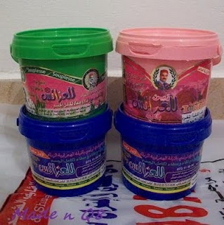 شوفي ياعسل أعرف وحدة مغربية لمن شافت الصابون الأسود اللي بنشتريه على أساس إنو مغربي قالت لنا إنتبهو موهو هذا لايضحكو عليكم ..وسبحان الله مرة رحت معاها لمهرجان التسوق بجدة وكان فيه ركن مغربي يبيعو فيه منتوجات مغربية من ضمنها صابونتهم تجي في علب ملونة وتكون بنكهات(خزامى وورد..)ومش فاكرة إيش كمان فقالت لي هو هذا الصابون اللبي بنستخدمه أخذت الخزامى لونه نيلي زي نيلة الملابس بس مايبقع عالجسم وتقول إنو اللي بالورد لونه وردي ويورد الجسم ..وهذي صورته)