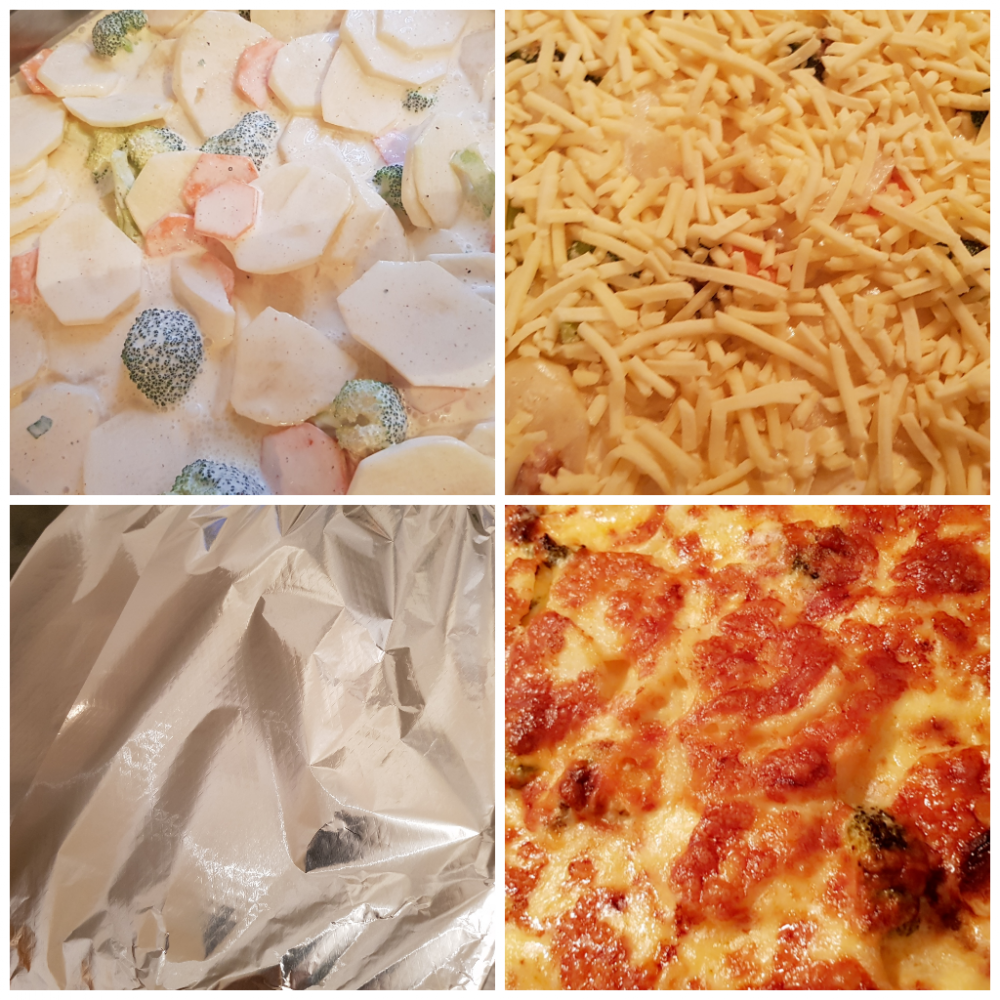 حمي الفرن وحطيهانص ساعة بس بدون جبنة لحتا تستوي البطاطا والجزر حتا تعرفي ان ستوت جيبي شوكة وغزيا بالبطاطا واذا لقيتيا ستوت طلعيها ورشي عليا الجبنة ورجعيا عالفرن نص ساعة حتا تحمر. وهي الطبخة بالصور وبالخطوات ان شاء الله تعجبكون.