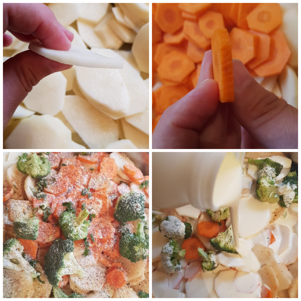 قشري البطاطا والجزر وافرميهم مدور متل الصورة بس لا تعمليا سميكة رفعيا متل الصورة حتا تستوي.