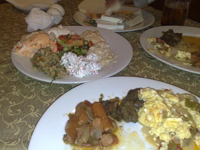 وشكشوكة وبيض مسلوق وامليت وأجبان بأنواعها ونقانق ومشروبات ساخنة شاي وحليب وقهوة .. وعصائر طازجة ...