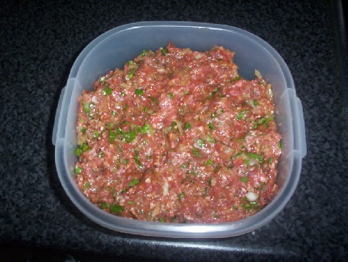 نمزج اللحم المفروم مع البهارات والملح ....ونتركه على الاقل ساعتين في الثلاجة .......
