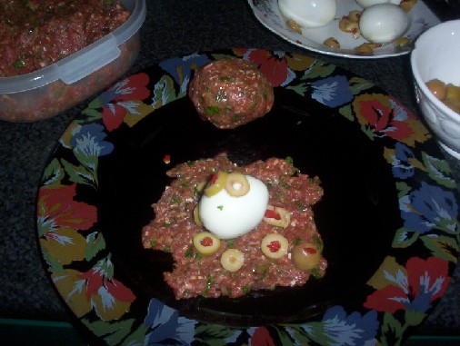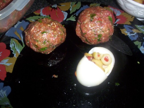 نحشي الكفتة بالبيض كما هو مبين بالصورة بالبيض والزيتون ونشكلها على شكل كرات ....