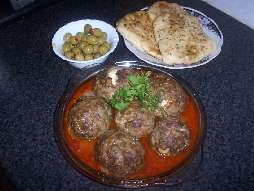 500 غرام لحم مفروم + 2 بصل مفروم + 5 بيض مسلوق + زيتون اخضر + بقدونس + زعفران + 2 ملعقة