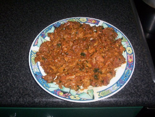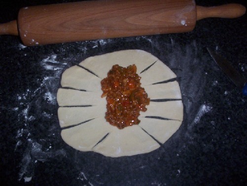 نضع الزيت في اناء على النار نضيف البصل حتى يذبل ......الفلفل ....الكفتة.....البهارات ونحرك جيدا .......