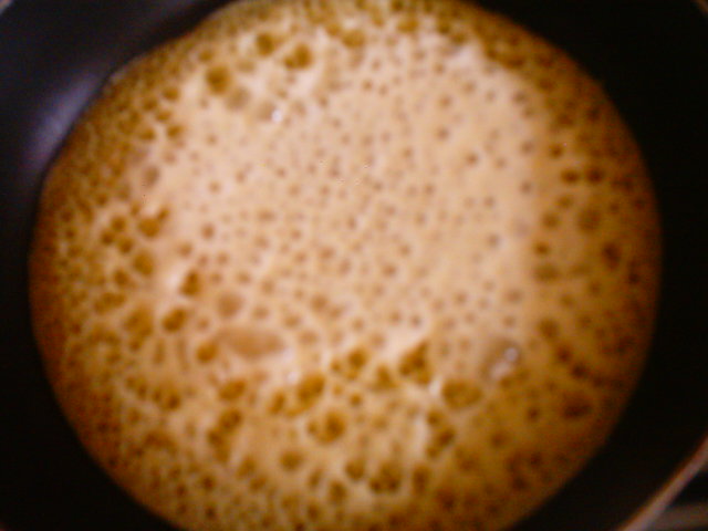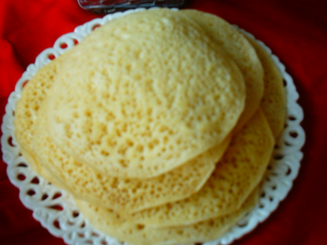 في مقلاة طيفال نضع مغرفة متوسطة من الخليط (مثل البان كيك ) افوق نار هادئة الى ان تستوي مع تكون ثقوب