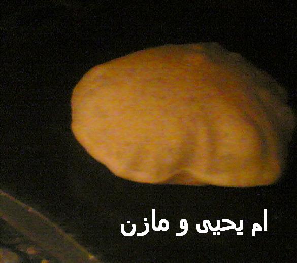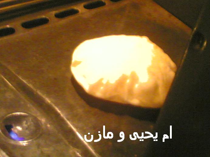 ** و بعد ما يرتفع او ينتفخ الرغيف كدا و تلاقيه احمر من تحت اقلبيه على وشه عشان بحمر