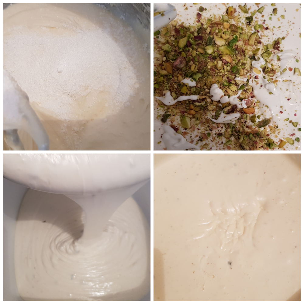 في وعاء حطي كوب الحليب والكريم شانتيه واخفقي لحتا بتجانسو ثم اضيفي كوب السكر واخفقي كملان ليتجانسو ثم نضيف علبة قشطة ونخفق ثك كوبين الحليب الناشف ونخفق جيدا ثم السحلب والمستكة ونخفق جيدا رح تلاحظي ان الخليط صار مطاطي وهيدا المطلوب نضيف كوب الماء تدريجيا ونخفق حتا يصير الخليط مطاطي وبعد ما نخلص خفق نضيف نص كوب فستق مطحون ونخفق جيدا.
