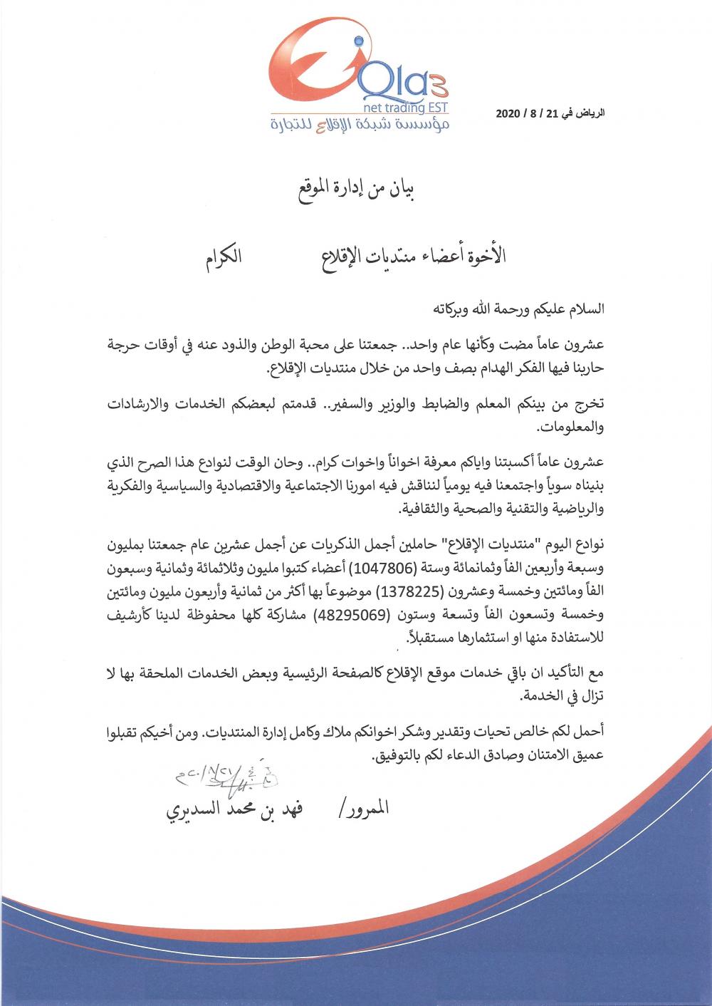 اعلن مؤسس منتديات "الإقلاع" فهد بن محمد السديري يعلن رسميًا إغلاق المنتدى في بيان رسمي.